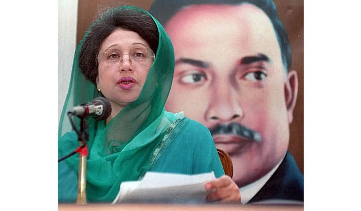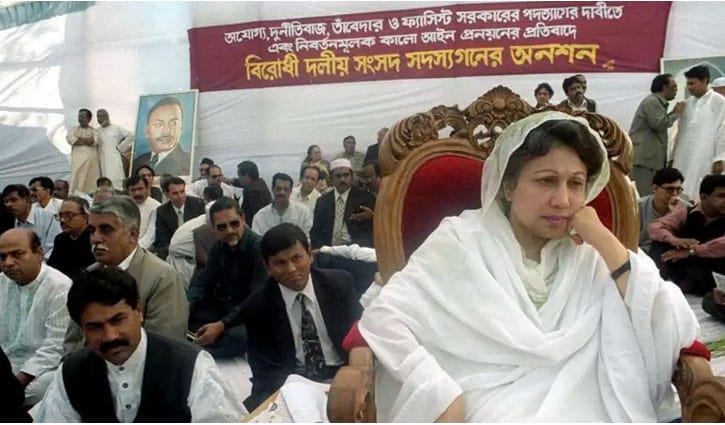 ক্ষমতাসীন আওয়ামী লীগের জননিরাপত্তা আইন পাসের প্রতিবাদে পল্টন ময়দানে বিরোধীদলীয় সংসদ সদস্যদের অনশন কর্মসূচিতে খালেদা জিয়া। ছবিটি তোলা হয় ২০০০ সালের ৮ ফেব্রুয়ারি।