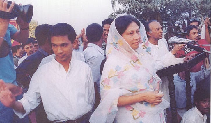 ১৯৯১ সালে নির্বাচনে জয়ের পর রাজধানীর শেরেবাংলা নগরের জনসভায় ছেলে তারেক রহমানকে নিয়ে খালেদা জিয়া।
