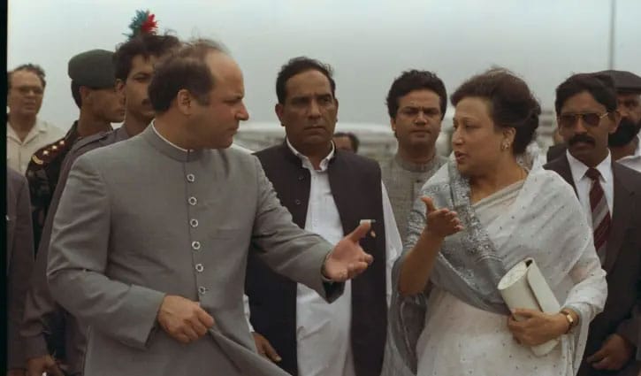 বাংলাদেশে ১৯৯১ সালের ঘূর্ণিঝড়ের পর প্রয়োজনীয় ত্রাণ সহায়তা নিয়ে আসা পাকিস্তানের প্রধানমন্ত্রী নওয়াজ শরীফকে ঢাকা বিমানবন্দরে স্বাগত জানান প্রধানমন্ত্রী খালেদা জিয়া। ছবিটি তোলা হয় ৫ মে, ১৯৯১।