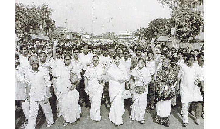 এরশাদের পতনের পর খালেদা জিয়ার নেতৃত্বে সংগ্রামী ছাত্র–জনতার ঐতিহাসিক বিজয় মিছিল। ৫ ডিসেম্বর ১৯৯০। ছবি: লুৎফর রহমান বীনু, গণতন্ত্রের সংগ্রাম বই থেকে।