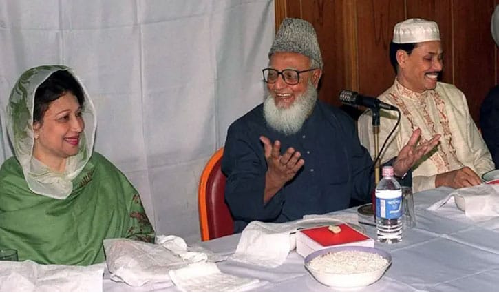 ১৯৯৯ সালের ২৩ ডিসেম্বর এক ইফতার পার্টিতে তৎকালীন তিন বিরোধীদলীয় নেতা। (বাম থেকে ডানে) খালেদা জিয়া, গোলাম আযম ও হুসেইন মুহম্মদ এরশাদ।