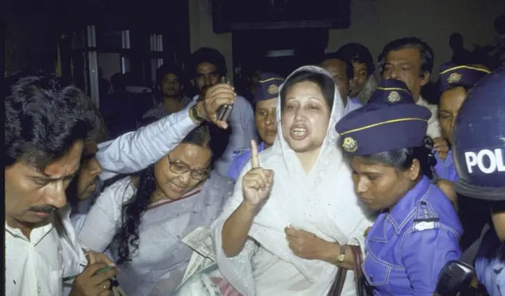 ১৯৮৭ সালের পয়লা নভেম্বর এরশাদ সরকারবিরোধী আন্দোলনের সময় খালেদা জিয়াকে আটক করে পুলিশ।