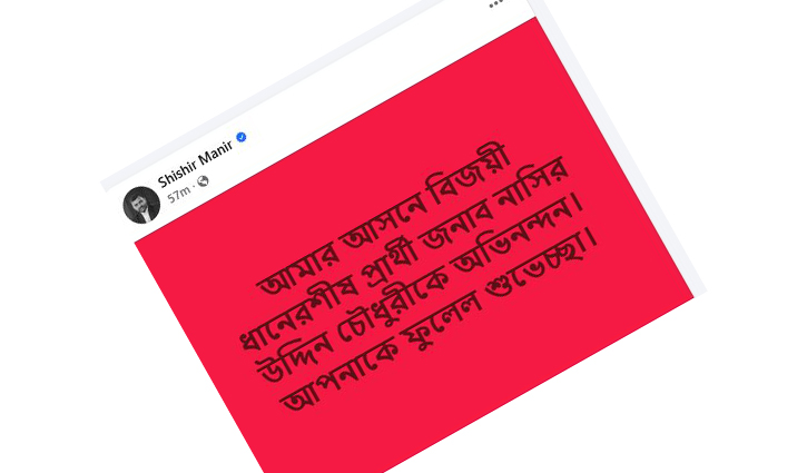 ফেসবুক স্ট্যাটাসে শিশির মনির লেখেন, “আমার আসনে বিজয়ী ধানের শীষ প্রার্থী নাসির উদ্দিন চৌধুরীকে অভিনন্দন। আপনাকে ফুলেল শুভেচ্ছা।”