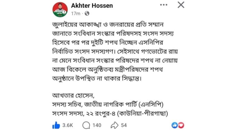 আখতার হোসেন লেখেন, “জুলাইয়ের আকাঙ্খা ও জনরায়ের প্রতি সম্মান জানাতে সংবিধান সংস্কার পরিষদসহ সংসদ সদস্য হিসেবে পরপর দুইটি শপথ নিচ্ছেন এসনিপির নির্বাচিত সংসদ সদস্যগণ। সেইসাথে গণভোটের রায় না মেনে সংবিধান সংস্কার পরিষদের শপথ না নেওয়ায় আজ বিকেলে অনুষ্ঠিতব্য মন্ত্রীপরিষদের শপথ অনুষ্ঠানে উপস্থিত না থাকার সিদ্ধান্ত।