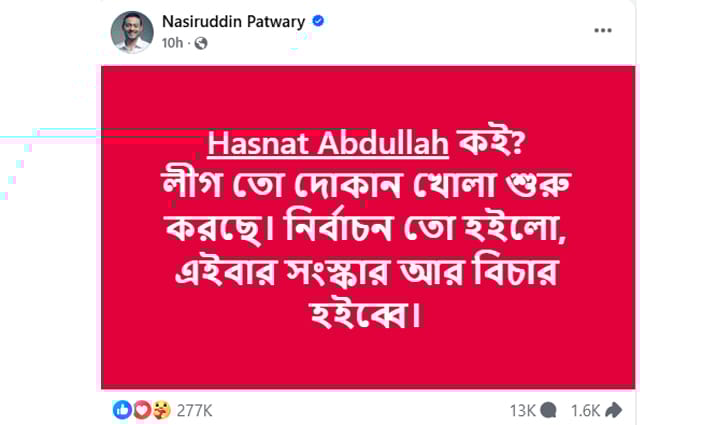 নাসীরুদ্দীন পাটওয়ারী লিখেছেন, “Hasnat Abdullah কই? লীগ তো দোকান খোলা শুরু করছে। নির্বাচন তো হইলো, এইবার সংস্কার আর বিচার হইব্বে।”