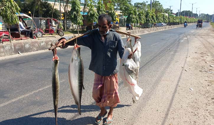 রংপুর নগরীতে কাঁধে মাছ বিক্রি করছেন কাজল।