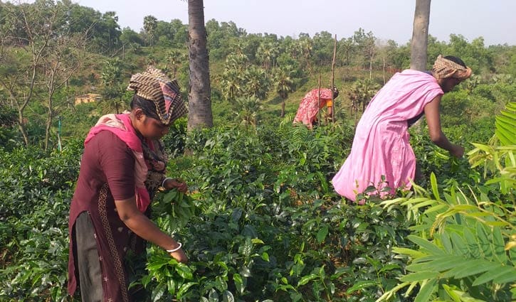 লাল মাটিতে জন্ম নেওয়া গাছ থেকে চা পাতা সংগ্রহ করছেন শ্রমিকরা
