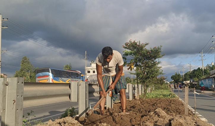 সড়কদ্বীপে সবজি চাষ করতে মাটিতে সার দিচ্ছেন এক কৃষক