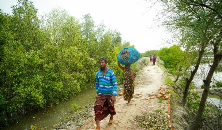 সাতক্ষীরা উপকূলে একটি নদীর তীর রক্ষা বাঁধের পাশে করা বনায়ন