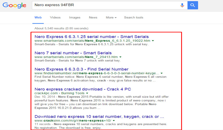 গুগল সার্চে সফটওয়্যারটির নাম এবং তার সঙ্গে 94FBR লিখে সার্চ দিন (উদাহরস্বরূপ : Nero Express 94FBR)। গুগল সার্চে সফওয়্যারের নামের সঙ্গে 94FBR সার্চ দেওয়া মাত্রই সার্চ ফলাফলে আপনি সিরিয়াল কি পেয়ে যাবেন।