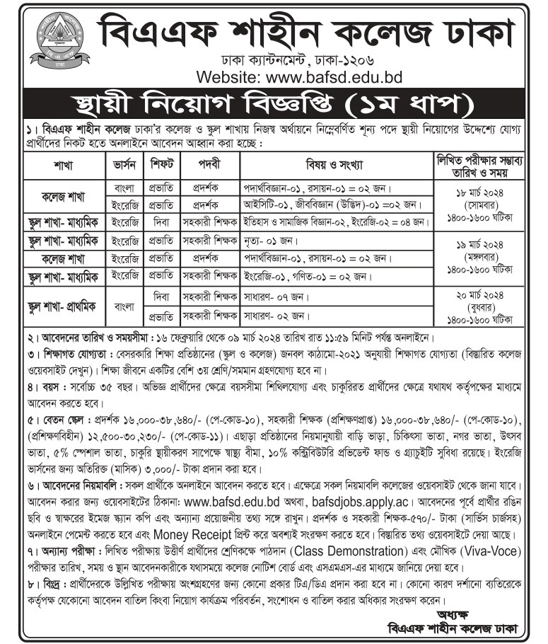 বিএএফ শাহীন কলেজ ঢাকা’র স্কুল ও কলেজ শাখায় চাকরি
