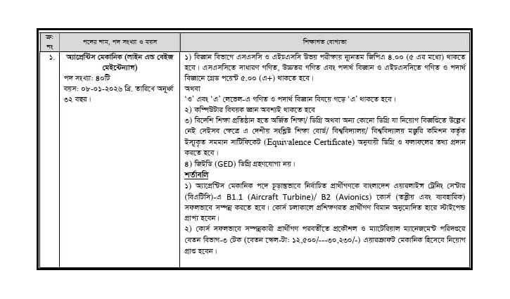 জনবল নিয়োগের জন্য বিজ্ঞপ্তি প্রকাশ করেছে বিমান বাংলাদেশ এয়ারলাইন্স লিমিটেড। ‘অ্যাপ্রেন্টিস মেকানিক (লাইন অ্যান্ড বেইজ মেইন্টেন্যান্স)’ পদে ৪০ জনকে নিয়োগ দেবে প্রতিষ্ঠানটি। আগ্রহী প্রার্থীরা অনলাইনের মাধ্যমে আগামী ৬ ফেব্রুয়ারি পর্যন্ত আবেদন করতে পারবেন।