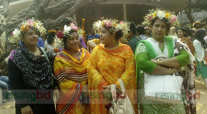 ঢাকা বিশ্ববিদ্যালয়ের শিক্ষার্থীরা বিশেষ করে মেয়েরা মনের আনন্দের সঙ্গে পোশাকেও জড়িয়েছে বসন্তের রঙ। বাসন্তী রঙের শাড়ির সঙ্গে কেউ খোঁপায় গুঁজেছেন হলুদ গাঁদা কিংবা লাল গোলাপ। কারো বা কপালে টিপের সঙ্গে মাথায় ছিল নানা রকমের ফুলে জড়ানো মুকুট। ছেলেদের পাঞ্জাবি বা ফতুয়ায়ও ছিল বসন্তের সঙ্গে সাদৃশ্যপূর্ণ রঙের আবহ। যেন ‘হারিয়ে যেতে আজ নেইকো মানা’।