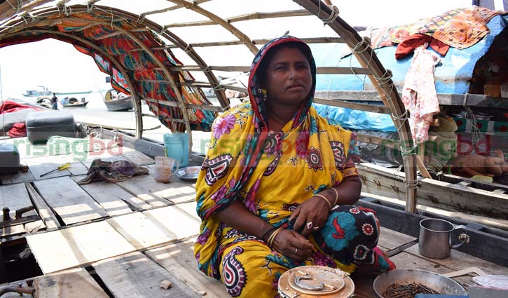 আছমা বেগম, বয়স ৪২। জন্ম হয়েছে নৌকায়, বিয়ে হয়েছে নৌকায়, সারাজীবন মাছধরা পেশায় রোজগার করেছেন। এখন থাকেন পটুয়াখালীর রাঙ্গাবালীর চরমোন্তাজের স্লুইজ বাজারের মাছঘাটে। নদীতে মাছধরা শেষে নৌকা ভেরে এই ঘাটে। হাটবাজার, রান্না, খাওয়া-দাওয়া, অবশেষে আবার মাছধরার পালা শুরু। স্বামী দানেশ সরদারের সঙ্গে আছমা বেগমের বিচ্ছেদ হয়ে যায় অনেক আগেই। ফলে ১ মেয়ে আর ৩ ছেলেকে নিয়ে সারাজীবন মাছধরা পেশায় থেকেছেন, এখনও আছেন। ছেলেরা বিয়ে করে পৃথক নৌকা করেছেন। বিয়ে দেওয়ার পর মেয়ে লিপিও স্বামীর সঙ্গে পৃথক নৌকায়। মায়ের মতোই লিপি বেগমেরও একই অবস্থা। জন্ম হয়েছে নৌকায়, বড় হয়েছেন নৌকায়, বিয়ে হয়েছে নৌকায়। নিজে মাছধরা পেশায় আছেন, তাকে আবার সহযোগিতা করছেন ছেলেমেয়েরা। লিপি বেগমের তিন ছেলেমেয়ে জুলিয়া, সুমাইয়া আর আসলাম। বড় দুটো স্কুলে যাচ্ছে দাবি করলেও তারা প্রকৃতপক্ষে নৌকায় বাবা মাকেই সহায়তা করে। নৌকায় জাল টানা, রান্নায় সহযোগিতা করা আবার বনের কাছে নৌকা ভিড়লে লাকড়ি সংগ্রহের কাজও কিশোরীদের। এভাবেই ওরাও একদিন জেলে হয়ে ওঠে। লিপি বলছিলেন, নদী আমাদের বাঁচাইয়া রাখে। মাছ পাইলে আমরা বেশ ভালো থাকি, মাছ না পাইলে দেনায় জড়িয়ে পড়ি। মাছ ধরায় নিষেধাজ্ঞার সময় জেলেদের নামে যে সহায়তা আসে, তা আমরা পাই না। নৌকায় থাকি বলে আমাদের নাম তালিকায় ওঠে না। আমরা কী এদেশের নাগরিক না? একই আক্ষেপ লিপির মা আছমা বেগমের। বললেন, সব জায়গায় আমাদের মাছ ধরতে বাঁধা। আমরা কোথায় জাল ফেলবো। এদেশের নাগরিক হয়ে আমরা ভিক্ষুকে পরিণত হয়েছি। আমাগো কথা শোনার কেউ নাই। আমাগো সমস্যা কে সমাধান করবে?