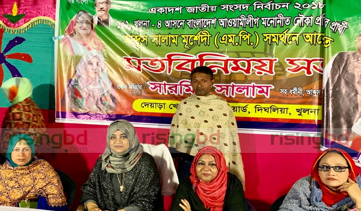 খুলনা-৪ আসনে আব্দুস সালাম মুর্শেদীর স্ত্রী সারমিন সালামও স্বামীর পক্ষে রূপসা, তেরখাদা ও দিঘলিয়া উপজেলার বিভিন্ন এলাকার পাড়া-মহল্লায় মতবিনিময়সভা, সামাজিক বিভিন্ন অনুষ্ঠানে অংশ গ্রহণসহ ব্যাপক গণসংযোগ করছেন। তিনিও ৩০ ডিসেম্বরের নির্বাচনে নৌকায় ভোট দিয়ে তার স্বামীকে বিজয়ী করতে এলাকার ভোটারদের প্রতি আহ্বান জানান।