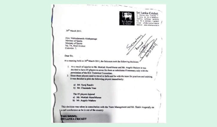 সানডে টাইমসের এক প্রতিবেদনে উঠে এসেছে এ তথ্য। যেখানে তারা অতুলগামাগের সাইন করা সেই চিঠিটির ছবি প্রকাশ করেছে। ফাইনালের আগে ৩০ মার্চ ২০১১ তারিখে ক্রীড়া মন্ত্রণালয়ের কাছে চিঠিটি দেওয়া হয়েছিল। আর যার ফলে নিজের তোলা অভিযোগ প্রমাণে ব্যর্থতা ও মিথ্যার আশ্রয় নিয়েছেন অতুলগামাগে সেই চিত্রই ফুটে ওঠে। আর তাই এখন বরং প্রশ্ন উঠছে অতুলগামাগের অবস্থান নিয়েই।