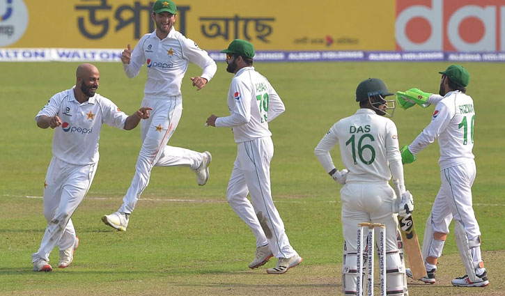 মুশফিকের আউটের পর সাকিব বেশ সতর্ক ছিলেন। প্রতি আক্রমণ করেছেন শতভাগ নিশ্চিত হয়েই। মিরাজ তাকে সঙ্গও দিচ্ছিলেন। কিন্তু বাবর আসার পর সব এলোমেলো। মিরাজ প্রথম ইনিংসে সুইপ করতে গিয়ে বোল্ড হন। এবার বাবরকে একই শট খেলতে গিয়ে এলবিডব্লিউ। আন্তর্জাতিক ক্রিকেটে প্রথমবার বল করতে এসে বাবরকে উইকেট উপহার দিলেন মিরাজ। সাকিব এক ওভার পরই সাজিদের শার্প টার্ন ডেলিভারিতে বোল্ড। সর্বোচ্চ ৬৩ রান করা সাকিব ফেরার সঙ্গে সঙ্গে বাংলাদেশের আশার সূর্যও ডুবে যায়। ৪৭ বলে শেষ ২ উইকেট হারিয়ে ভুলে ভরা ব্যাটিংয়ের সমাপ্তি।