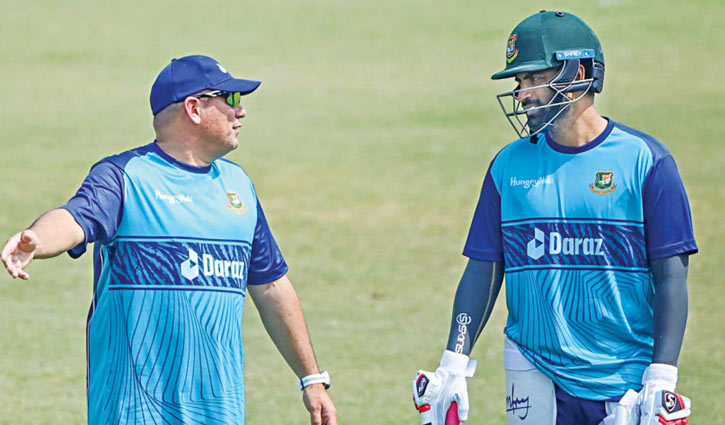 কোচ ডমিঙ্গোর সঙ্গে বাংলাদেশ জাতীয় ক্রিকেট দলের ওয়ানডে অধিনায়ক তামিম ইকবাল