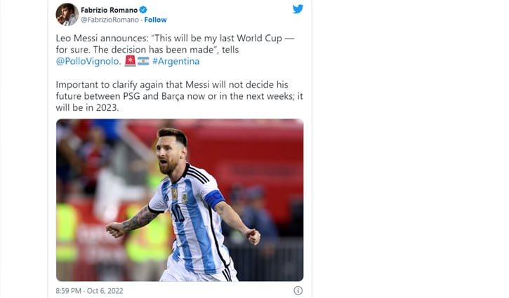 কাতারেই শেষ। তার পর আর বিশ্বকাপে দেখা যাবে না লিওনেল মেসিকে। বাঁ পায়ের জাদুকর স্বয়ং নিজের ভবিষ্যতের কথা জানিয়ে দিয়েছেন। সোশ্যাল মিডিয়ায় যা ছড়িয়ে পড়েছে। লিও মেসি বলেছেন, ‘এটাই (কাতার বিশ্বকাপ) আমার শেষ বিশ্বকাপ। সিদ্ধান্ত নিয়ে ফেলেছি।’ তবে প্যারিস সাঁ জাঁ নাকি বার্সেলোনার জার্সি গায়ে দেখা যাবে বিশ্ব ফুটবলের রাজপুত্রকে, তা এখনও স্থির করেননি এলএম১০। ২০২৩ সালে সেই ব্যাপারে সিদ্ধান্ত নেবেন আর্জেন্টাইন মহাতারকা।