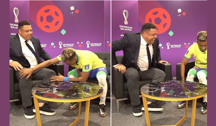 ঘটনাটি গতকাল ব্রাজিল ও সুইজারল্যান্ড ম্যাচ শেষে। গ্যালারিতে বসে দলের জয় উপভোগ করেছেন রোনাল্ডো। তার সঙ্গে ছিলেন বিশ্বকাপজয়ী অধিনায়ক কাফু, রবার্তো কার্লোস ও কাকা। ম্যাচ শেষে রোনাল্ডো টিভিকে সাক্ষাৎকার দিতে হাজির হন ব্রাজিলের তরুণ তুর্কী রদ্রিগো। দ্বিতীয়ার্ধে মাঠে নেমে ব্রাজিলের আক্রমণে শক্তি বাড়ান রিয়াল মাদ্রিদে খেলা এই ফরোয়ার্ড।