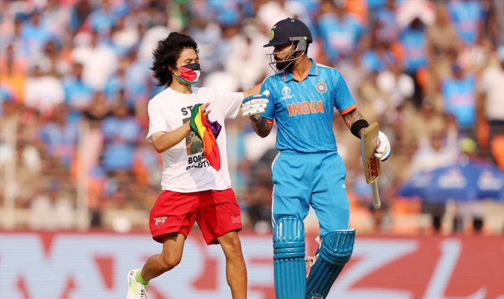 ভারতের ইনিংসের ১৪তম ওভারে, ফিলিস্তিনে হামলা বন্ধের দাবিসমৃদ্ধ টি শার্ট ও মাস্ক পরে ফাইনালের মাঠে অনুপ্রবেশ এক দর্শকের। বিরাট কোহলিকে জড়িয়ে ধরেন সেই দর্শক।