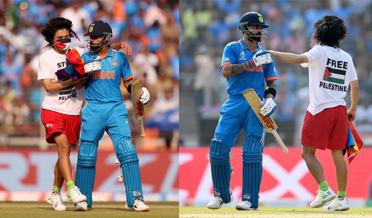 আজ রোববার আহমেদাবাদের নরেন্দ্র মোদী স্টেডিয়ামে ম্যাচের ১৪তম ওভারের সময় মাঠে ঢুকে পড়েন তিনি। দৌড়ে গিয়ে বিরাট কোহলিকে জড়িয়ে ধরেন। এরপর অবশ্য নিরাপত্তাকর্মীরা তাকে ধরে ফেলেন এবং মাঠের বাইরে নিয়ে যান।