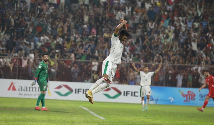 পাঁচ মিনিট অপেক্ষা। উল্লাসে ভাসে লাল-সবুজের দলও। ডি বক্সের ডান দিকে বল পেয়ে কোনাকুনি নিখুঁত এক শটে বল জালে জড়িয়ে দেন মোরসালিন। ১-১ গোলে সমতা আনে বাংলাদেশ।