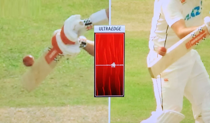 শরিফুল ইসলামের অফ স্টাম্পের বাইরের বল। ব্যাক অব লেংথের ডেলিভারিটা বের হয়ে যাচ্ছিলো, ব্যাট ছোয়ালেন মিচেল। কিন্তু ব্যাটে-বলে হলো না। ব্যাট চুমু খেয়ে বল জমা পড়ল উইকেটরক্ষকের গ্লাভসে।প্রথম স্লিপে দাঁড়ানো মাহমুদুল হাসান জয় আবেদন করলেন সঙ্গে সঙ্গে। কিন্তু দ্বিধায় ছিলেন নুরুল হাসান সোহান। ফলে আম্পায়ারও সাড়া দেননি তাতে।