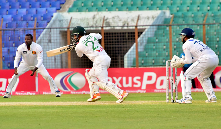 দেশে-শুনে বেশ সতর্কতার সাথে ব্যাট করছিলেন জাকির হাসান। তুলে নিয়েছিলেন টেস্ট ক্যারিয়ারের চতুর্থ ফিফটি। কিন্তু ফিফটির পর সাজঘরে ফিরেন তিনি। দলীয় ৯৬ রানের মাথায় বিশ্ব ফার্নান্দোর বলে দুর্ভাগ্যজনকভাবে বোল্ড হয়ে যান জাকির। ১০৪ বল খেলে ৮ চারে ৫৪ রান আসে তার ব্যাট থেকে। নতুন ব্যাটসম্যান হিসেবে মাঠে নেমেছে নাজমুল হোসেন শান্ত। ৩৪ ওভার শেষে বাংলাদেশের সংগ্রহ ২ উইকেটে ৯৯ রান।