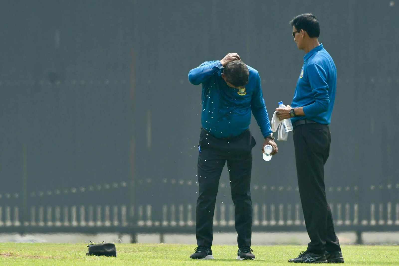 দাবদাহের তীব্রতার মাঝে পানির ঝাঁপটায় স্বস্তি খুঁজছেন আম্পায়ার।
