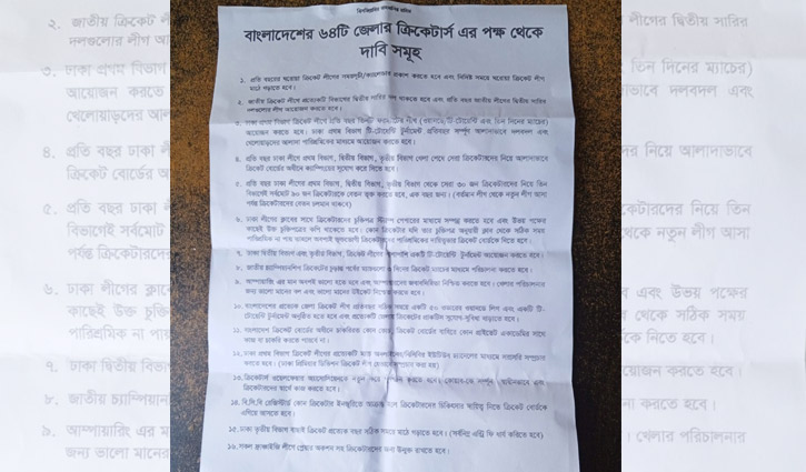 সারা দেশের ৬৪ জেলার ক্রিকেটাররা ১৬ দফা দাবি নিয়ে উপস্থিত হয়েছেন বাংলাদেশ ক্রিকেট বোর্ডে (বিসিবি)। দাবি যৌক্তিক হওয়ায় দেশের ক্রিকেটের নিয়ন্ত্রণ সংস্থা বিসিবি মেনে নেওয়ার আশ্বাসও দিয়েছে।