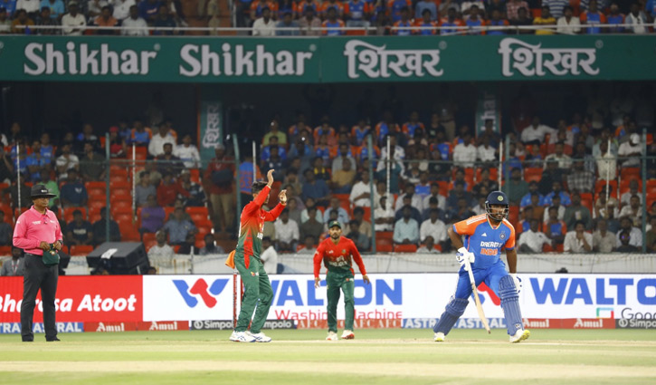 তাড়া করতে নেমে প্রথম বলেই উইকেট হারিয়েছে বাংলাদেশ। পারভেজ হোসেন ইমন ফেরেন গোল্ডেন ডাক মেরে। এর আগে তামিম দুবার, তানজীদ ১ বার করে প্রথম বলে আউট হয়েছেন। তৃতীয় টি-টোয়েন্টিতে সুযোগ পাওয়া তানজীদ ১২ বলে ১৫ রান করেন। এরপর চারে নামা লিটন দাস নীতিশ রেড্ডির ওভারে টানা পাঁচ চারে কিছুটা স্বস্তি এনে দেন। পরের ওভারে রবি বিষ্ণোই সুইপ করতে গিয়ে ফেরেন নাজমুল হোসেন শান্ত (১১ বলে ১৪)।
