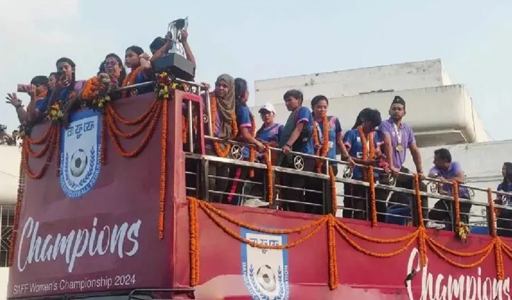 নেপাল, ভারত ও ভুটানের মতো দলকে উড়িয়ে দিয়ে বাংলাদেশ সাফের দ্বিতীয় শিরোপা জিতে আজ বৃহস্পতিবার (৩১ অক্টোবর) দুপুরে দেশে ফিরে। তাদের বিমানবন্দর থেকে ছাদখোলা বাসে করে নিয়ে আসা হয় বাংলাদেশ ফুটবল ফেডারেশনের (বাফুফে) মতিঝিলস্থ কার্যালয়ে। বিমানবন্দর থেকে বিকেল ৪টার দিকে রওয়ানা দিয়ে সন্ধ্যা ৭টার দিকে তারা পৌঁছায় বাফুফেতে। আসার পথে রাস্তার দুই ধারে মানুষ অভিনন্দন জানায় বাংলাদেশের মেয়েদের।