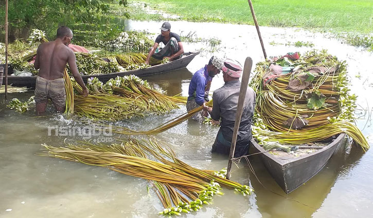 বর্ষা মৌসুমে মুন্সীগঞ্জের শ্রীনগর ও সিরাজদিখান উপজেলায় শাপলা উঠিয়ে বিক্রি করে চার শতাধিক পরিবারের দিন চলে।