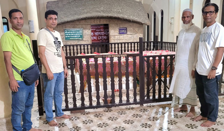 চলে আসি ভাসানীর সমাধিস্থলে। মাজার বলাই সঙ্গত। ভক্তরা মাজার বলেন। বিশাল উঁচু ছাদ এবং বিস্তৃত জায়গা নিয়ে সমাধিস্থল। লালসালুর মধ্যে নকশাঁর কাজ করা কাপড়ে আচ্ছাদন রয়েছে দুটি কবরে। পাশাপাশি দুটি কবর এখানে। একটি মাওলানা ভাসানীর অপরটি তাঁর স্ত্রী আলেমা ভাসানীর। কবরের পাশে একটি কুঁড়েঘর। মাওলানা ভাসানীর রাজনৈতিক দল ন্যাপের নির্বাচনী প্রতীক কুঁড়েঘর। আমরা কুঁড়েঘরের ভেতরে ঢুকে দেখতে পাই ভাসানীর ব্যবহৃত কাঠের মিটসেফ এবং চেয়ার রাখা আছে। সমাধিস্থলের তত্ত্বাবধায়ক বা খাদেম আমাদের সব ঘুরিয়ে দেখান এবং হুজুর সম্পর্কে নানাকিছু বর্ণনা করেন। কবরের বামপাশে একটি কক্ষ সংরক্ষিত আছে। এখানে মাওলানা ধ্যানে বসতেন বলে জানালেন খাদেম সাহেব। আসলে মাওলানা এই কক্ষটিকে ব্যক্তিগত অধ্যয়ন এবং প্রার্থনার জন্য ব্যবহার করতেন। খাদেম জানান প্রতি বছর জন্ম ও মৃত্যু দিবসে এখানে ‘ওরস’ হয়।