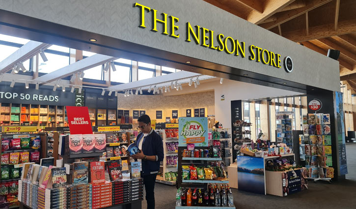নেলসন এয়ারপোর্টের অভ্যন্তরে বই এবং গিফট শপে লেখক