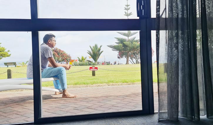 রুকে ঢুকেই মন প্রশান্তিতে ভরে গেলো। বিশাল বড় রুম! লাগেজ একপাশে রেখে রুমের আরেক মাথায় গিয়ে পর্দা সরালাম দুই পাশে। এবার মুগ্ধ হলাম পূর্ণরূপে। কাঁচের দরজার ওপাশে চওড়া লন। বিশ্বজুড়ে যে ঘাসের নাম এতদিন শুধু শুনেছি সেই নেপিয়ার ঘাসে লনটাকে মনে হচ্ছে সবুজ আর পবিত্র কার্পেট বিছিয়ে রাখা। চওড়া লন পেরিয়ে চোখ যায় আরও সামনে। তারপর? তারপর নীল সমুদ্র। যে নীলের শেষ দেখা যায় না। আর সমুদ্রের উপরে অনন্ত অম্বর। আমার মন অজান্তেই বলে দিলো- এই জায়গা ছেড়ে আর কোথাও যাব না। এ রকম স্বর্গীয় সুন্দর আর কোথাও নেই। আজীবন এখানেই থেকে গেলেই বুঝি জীবন সার্থক।