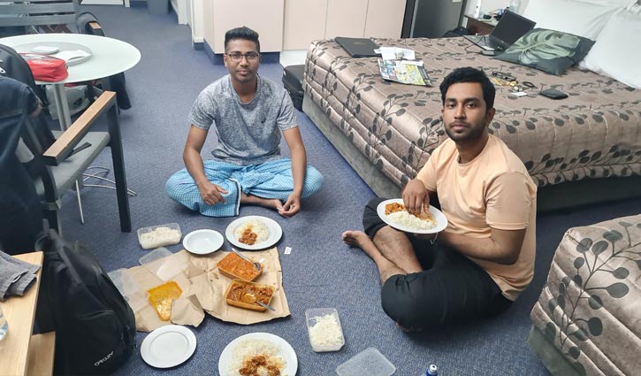 রুমে এসে মাহমুদ জিজ্ঞাসা করলো ভাই, খাবো কীভাবে? আমি রুমের সাথে লাগোয়া কিচেন কেবিনেট খুললাম। মাহমুদ তাকিয়ে হতভম্ব হয়ে গেলো। এই কেবিনেটের তাকে তাকে সাজানো খাবার প্লেট, গ্লাস, মগ, চামচ, কাটা চামচ, ওভেন, পানি গরম করা কেটলি, তিন চার রকমের চায়ের টি ব্যাগ, কফির প্যাকেট, গুঁড়া দুধ, প্যাকেট চিনি, বিস্কিট ইত্যাদি। বাহ, তাহলে তো আর কথাই নেই বলে মাহমুদের দু’গাল হাসিতে দুপাশে চওড়া হয়ে গেলো। জয়ন্ত ছোট টেবিলে খাবার সাজাতে হিমশিম খাচ্ছে দেখে আমি বললাম নিচেই বসি আমরা। জায়গা বড় আছে। জয়ন্ত খাবার নিয়ে কার্পেটের উপর বসে পড়ল। হাতে হাতে তিনজনই খাবারের প্লেট, বাটি, চামচ ধুয়ে বসে পড়লাম খেতে।